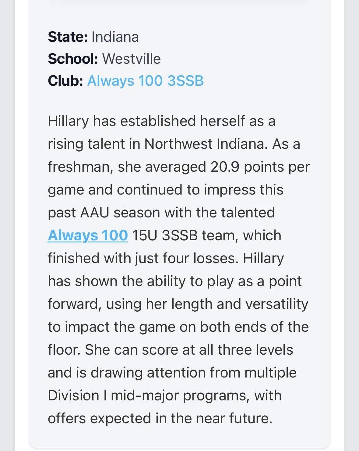 Contact Hillary's AAU Coach, AAU Director and High School Contact Information Page